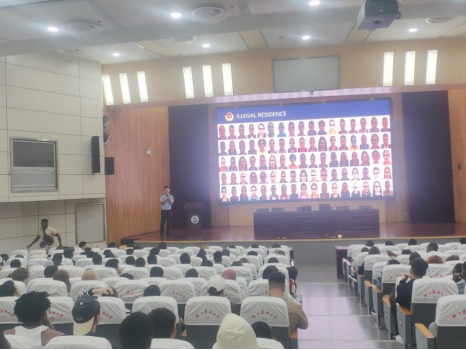 杭州市临安区出入境管理局外国人管理科王益龙警官为留学生新生作中国法律法规宣讲,全程用英文详细解读了《外国人出入境管理条例》,强调了留学生在华期间须遵守出入境、治安管理、禁毒法制、交通规章、依法宗教、民事调解相关中国法律法规,不得危害中国国家安全、破坏社会公共秩序,严禁非法居留、非法就业等,用生动的案例警醒新生,时刻保持敬畏,树立法治思维,提升法律意识。